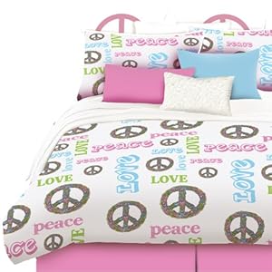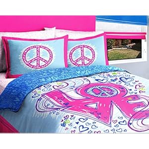 Create an entirely new look for the bedroom with this Tie Dye Peace complete bed ensemble. This complete bed ensemble in tie-dyed aqua blue and sprinkled with chocolate peace signs to add a whimsical touch to your bedroom decor.