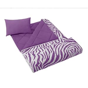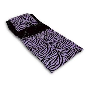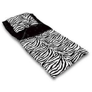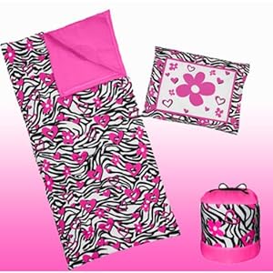 Pink White Zebra Microplush Sleeping Bag DescriptionZebra Microplush Juvenile Sleeping Bag with Attached Pillow - Pink/White 100% polyester microplush cover. Zebra pattern work. For indoor use. Roll up and shoulder strap for easy transport. Sleeping bed measures 55L x 60H inches. Pillow measures 16L x 20H inches.