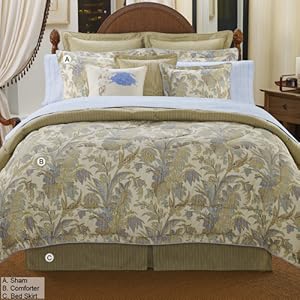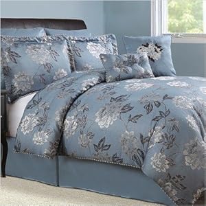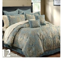 Knights Bridge 12-Piece Comforter Set. Knights Bridge 12-piece comforter set helps you to decorate your bedroom with the most popular bedding items, yet in a quick, convenient and fashionable manner. Included in this collection is a comforter, two pillow shams, two Euro shams, a bedskirt, two decorative pillows and four valances. This collection comes in a popular queen/king size to ensure no member of your family will ever outgrow this bedding ensemble. Knights Bridge 12-piece features golden jacquard scrolling amidst a soft blue background - a color scheme sure to bring out the romantic side in you.